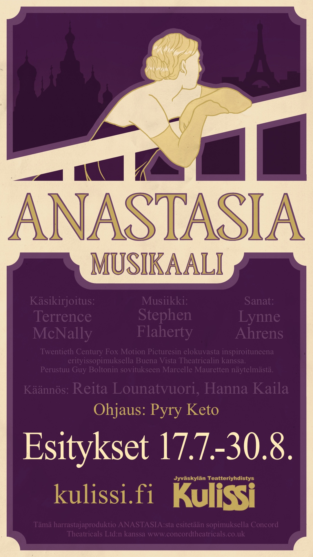 Rakastettuun Twentieth Century Foxin animaatioon pohjautuva Anastasia-musikaali sai Suomen ensi-iltansa vuonna 2022 Tampereen teatterilla ja nähdään nyt Kulissin lavalla heinä-elokuussa 2026! Musikaalin on kirjoittanut Terrence McNally, sen musiikin on säveltänyt Stephen Flaherty sekä laulujen sanat kirjoittanut Lynn Ahrens. Suomennoksesta ovat vastanneet suomalaisen musiikkiteatterin tehokääntäjätiimi Reita Lounatvuori ja Hanna Kaila.