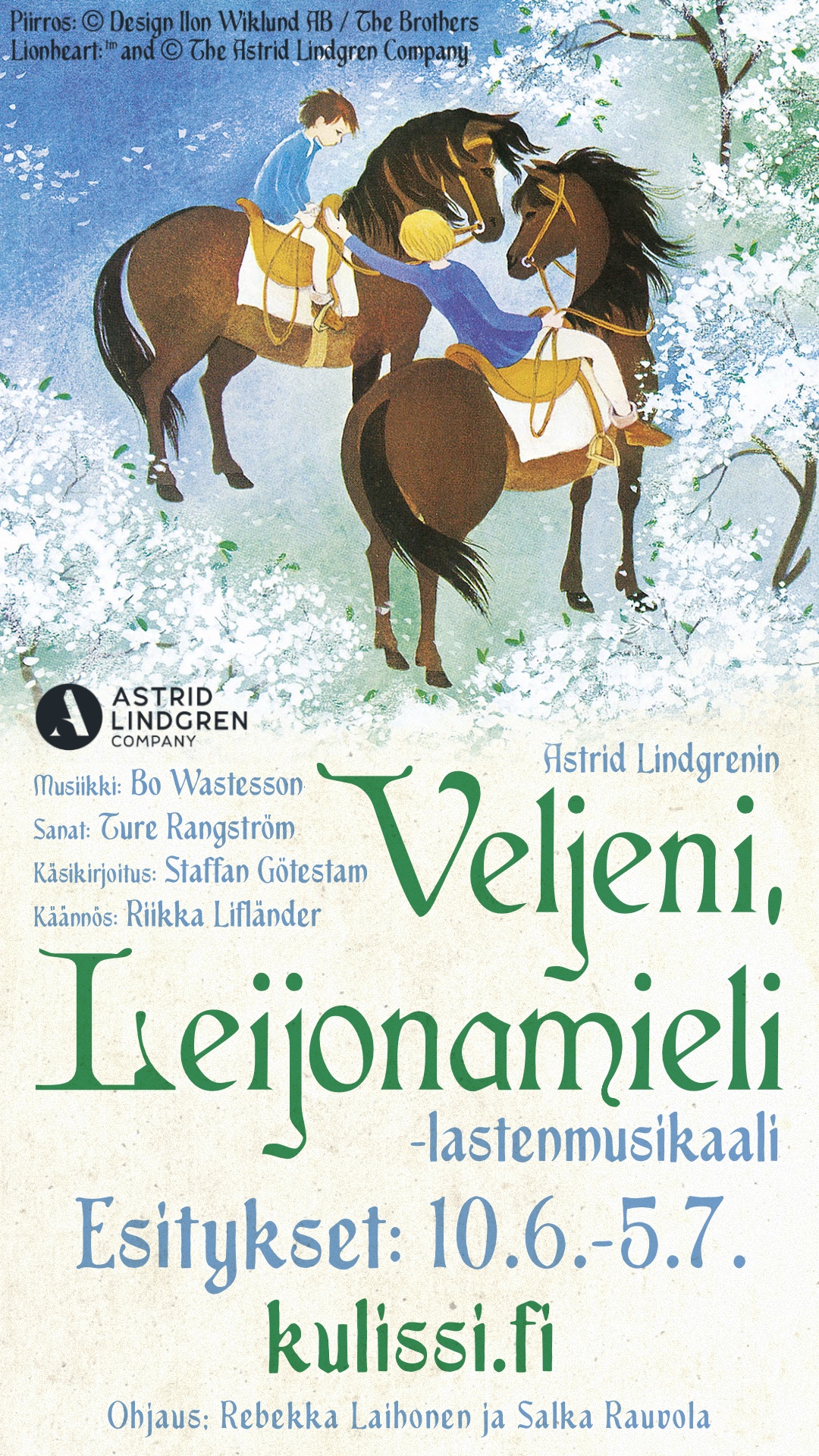 Veljeni, Leijonamieli-lastenmusikaali on kesän unohtumattumin seikkailu kohti rakkautta ja valoa. Ratsasta seikkailuun ja heitä ilmoille huuto vapaudesta!